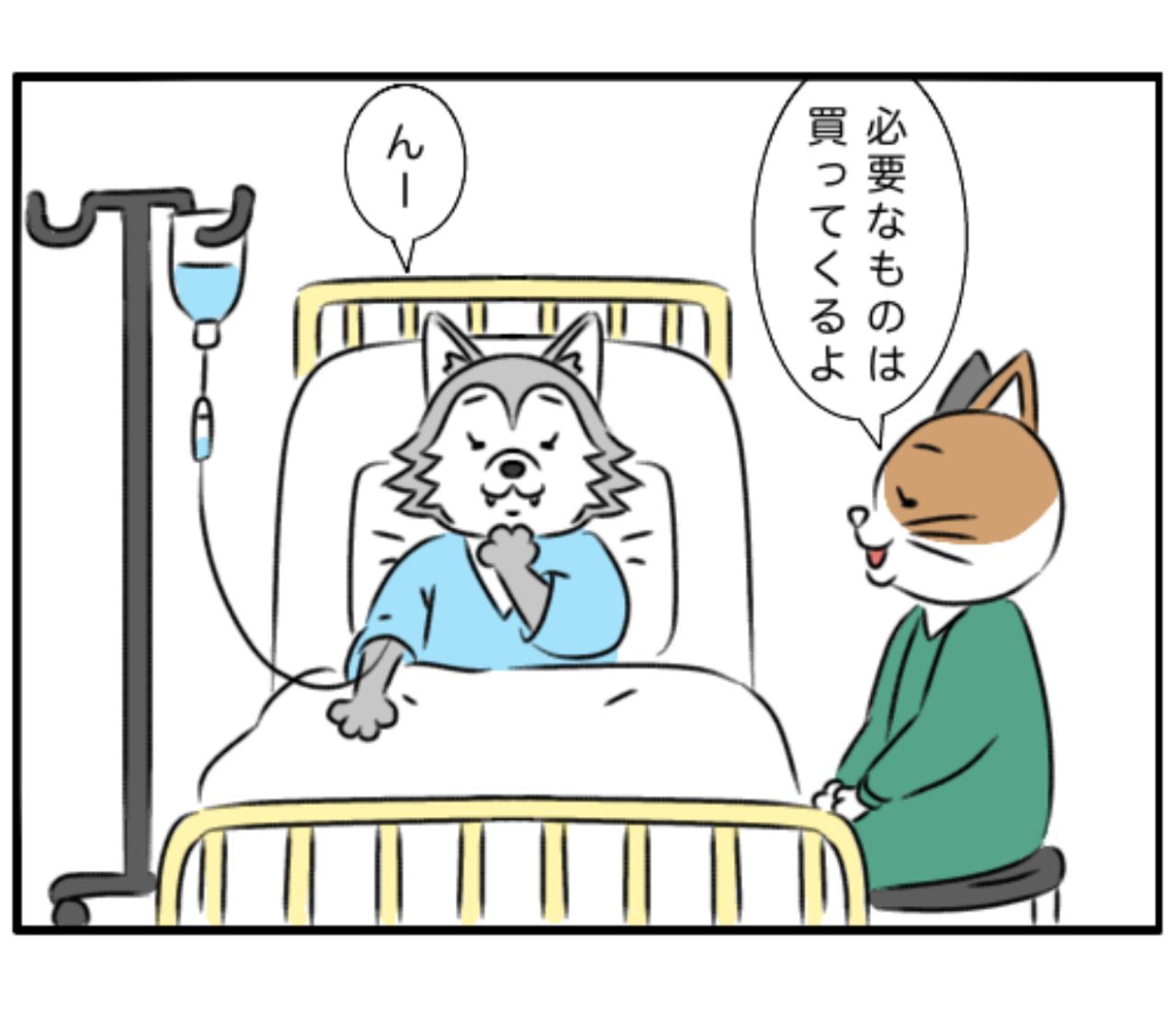 そんなある日のこと、ヨシコさんはうなじに帯状疱疹ができて入院しました。主治医の先生が、頭部に近いので大事を取って入院治療して下さったのです。エモちゃんはお見舞いに行きました。1人暮らしなので、入院生活もきっと不自由なはずです。必需品など買い出ししようと思いました。すると、